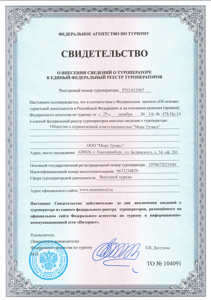 Реестровые номера: ООО «Море Трэвел» РТО 013907, ООО «Море Трэвел. Русский клуб» РТО 003405