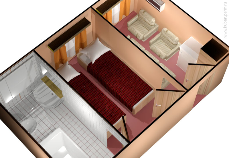 Описание: 2-х местная, 2-х комнатная, 1-но ярусное расположение, душ, ванна, туалет, кондиционер, холодильник. Площадь: 20 кв.м.