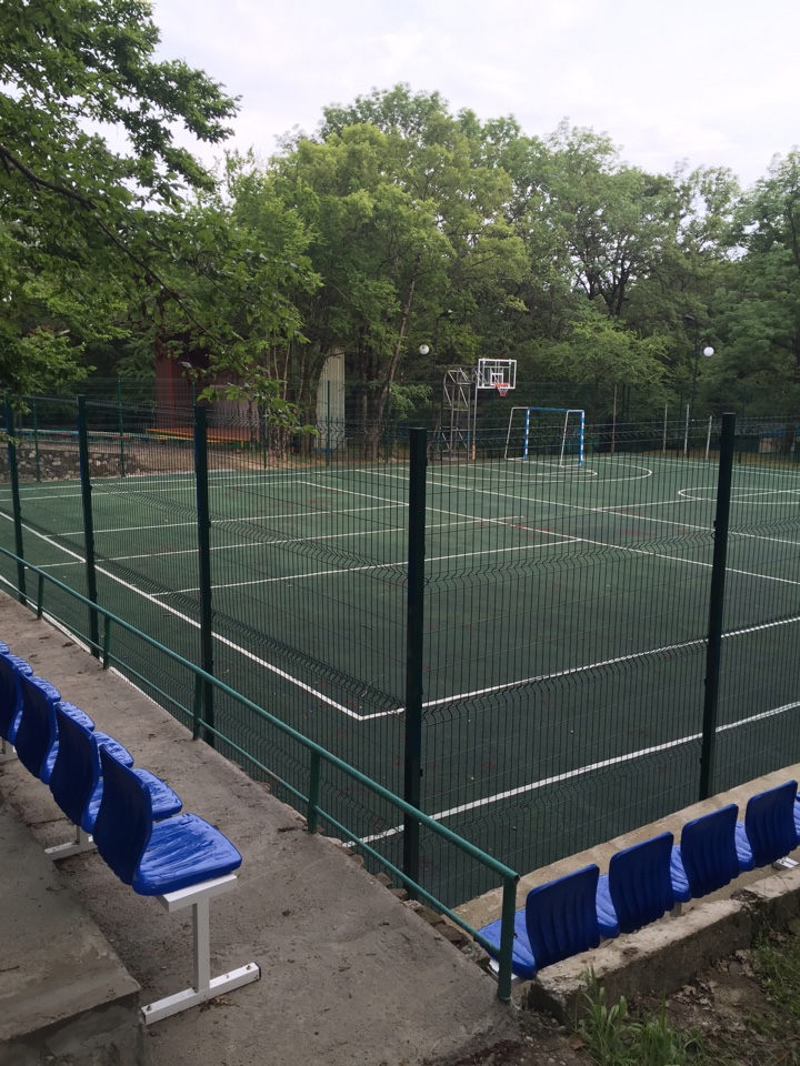 На территории расположены спортивные площадки со специальным покрытием для игры в баскетбол, волейбол, большой теннис. Отдельная площадка с покрытием искусственной травы для игры в мини футбол. Площадка с тренажерами, теннисные столы, прокат спортивного инвентаря. Крытый многофункциональный спортивный зал размером 40 на 25 метров для игр в баскетбол, волейбол, теннис, занятий гимнастикой, танцами, борьбой.