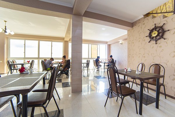 Отель предоставляет посетителям полноценное двухразовое питание, которое состоит из завтрака и обеда. Так же можно выбрать проживание без питания, благо вокруг много кафе, предлагающих разнообразные национальные, русские и европейские блюда.