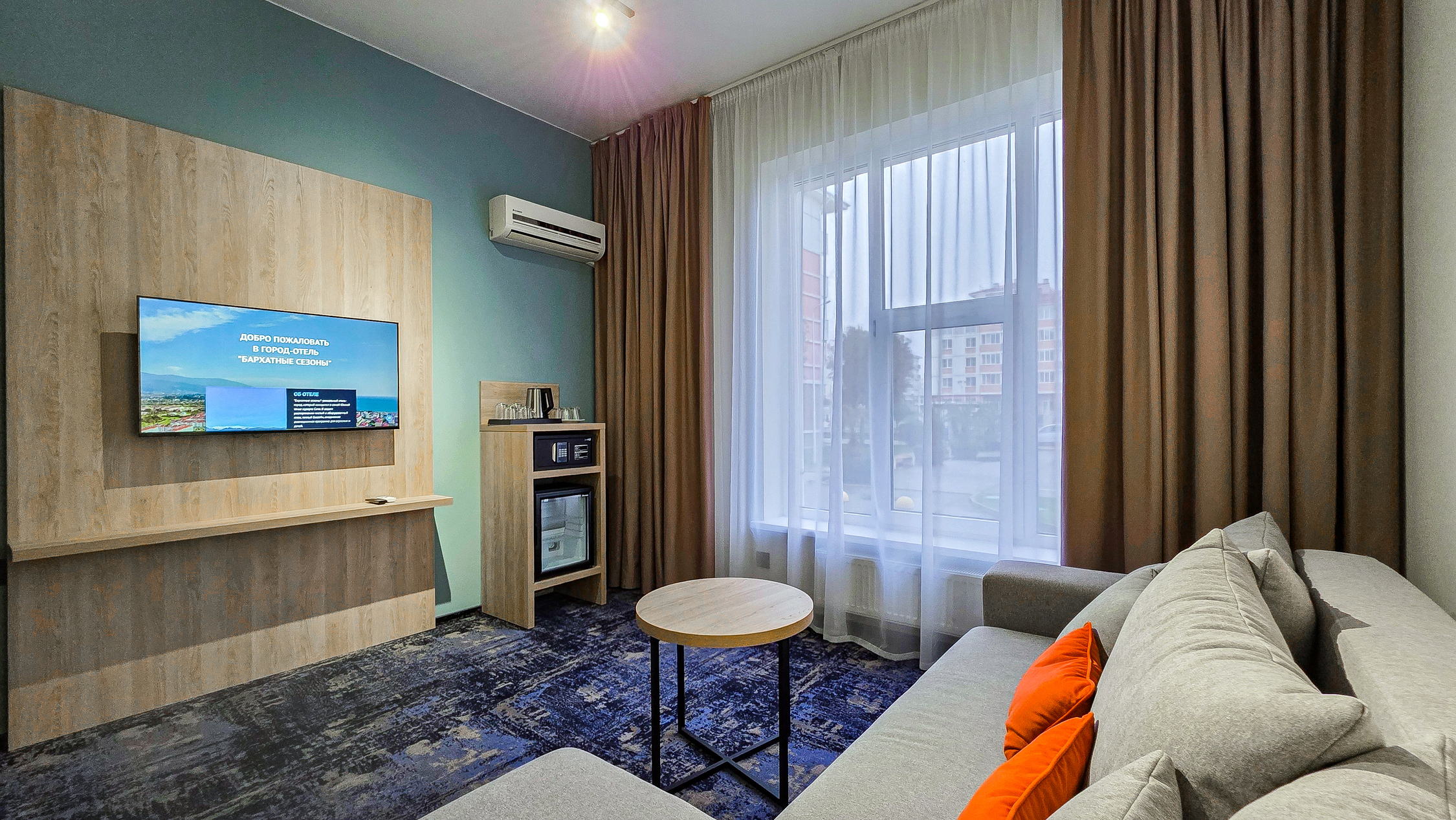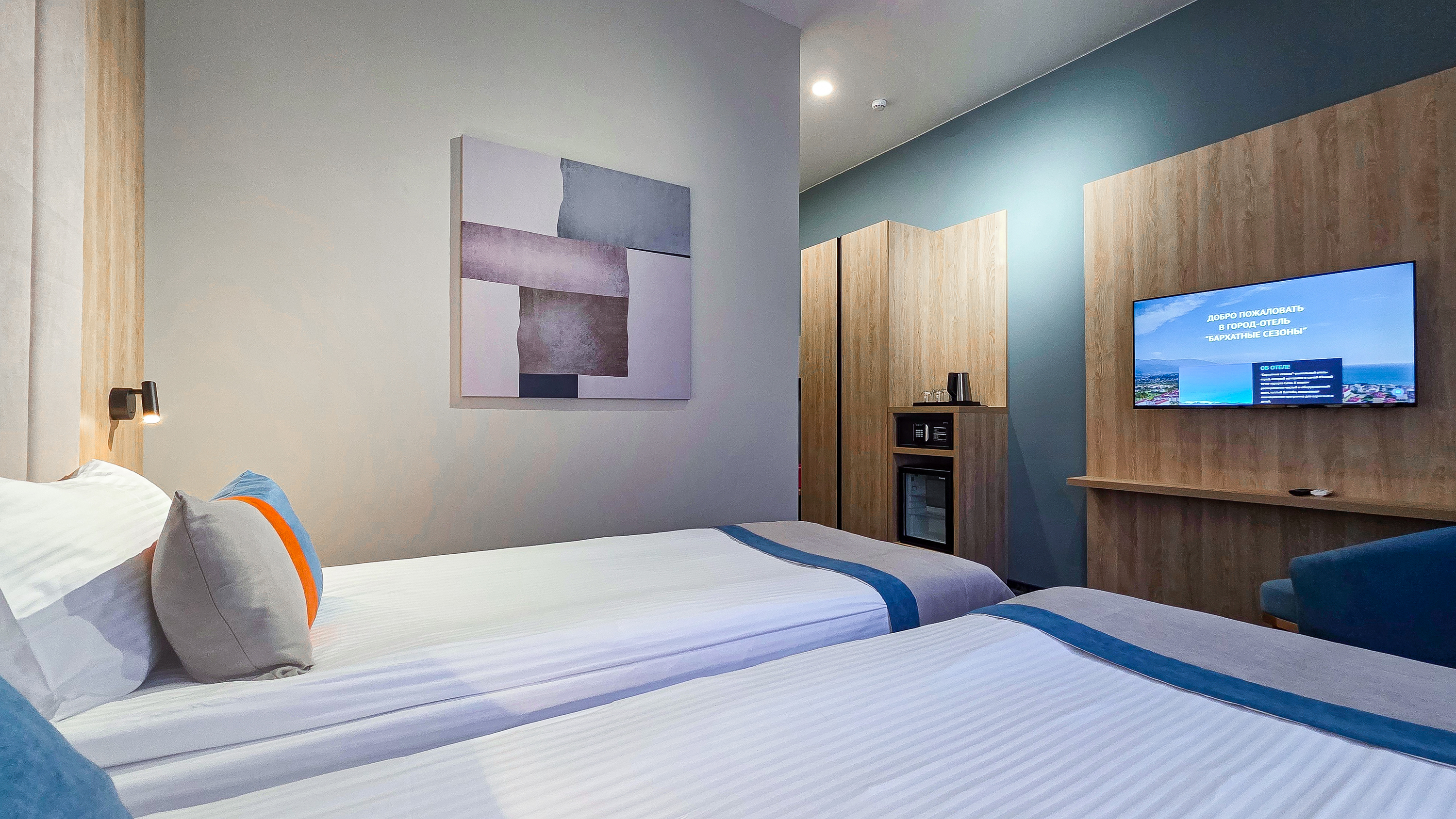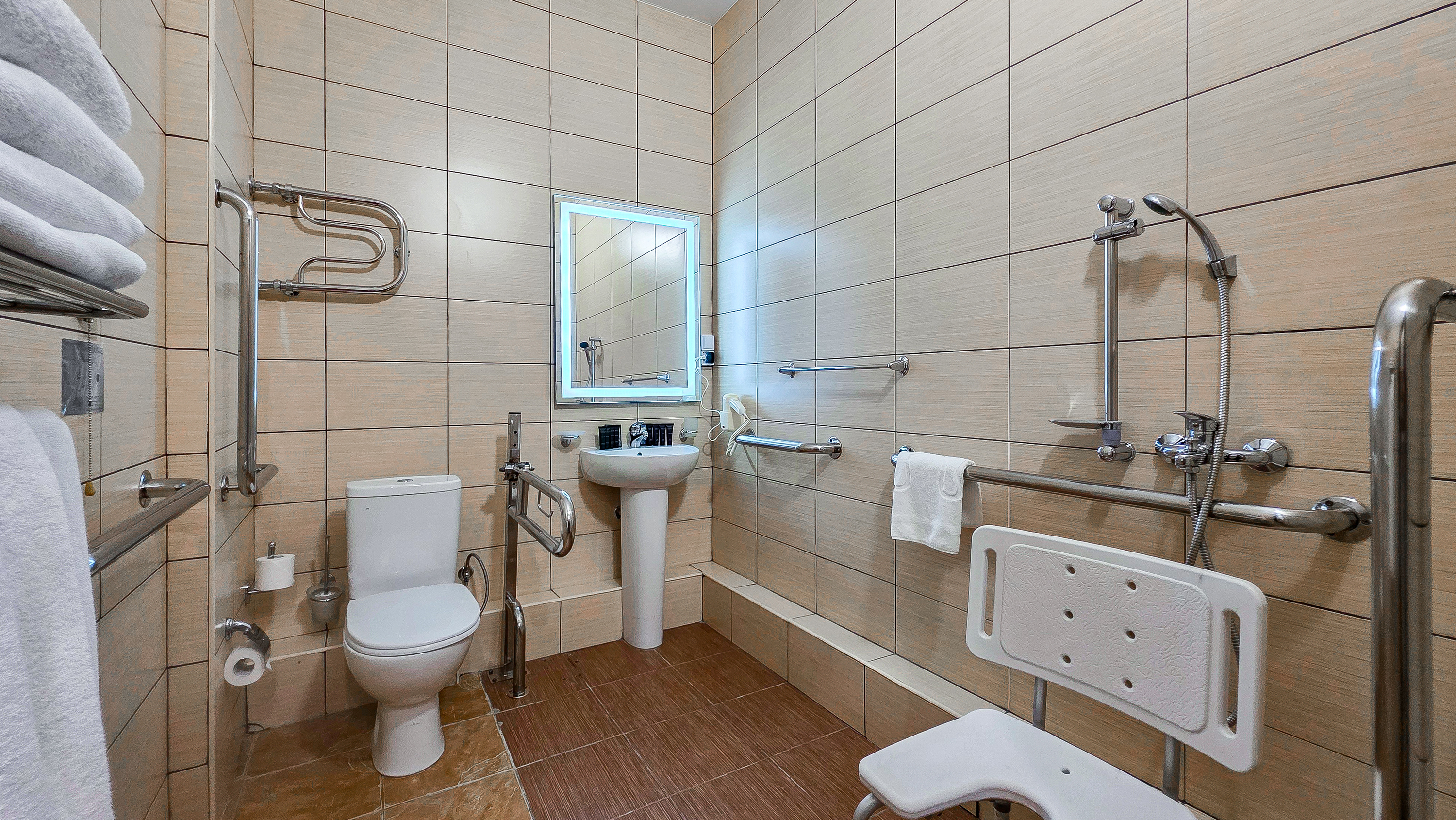 В городе-отеле «Бархатные сезоны» успешно реализован национальный проект «Доступная среда». На территории обустроены специальные парковки, установлены пандусы, оборудованы расширенные дверные проемы и функционируют просторные адаптированные лифты. Предусмотрены специально оборудованные номера различных категорий. Каждый номер оснащен удобной мебелью, поручнями в санузле, антискользящим покрытием и системой экстренного вызова персонала. Для удобного и безопасного спуска к морю на пляже оборудован пологий пандус. В распоряжении специальное пляжное кресло, для купания и спуска в воду.