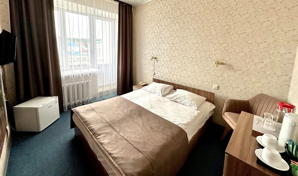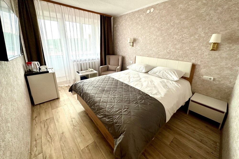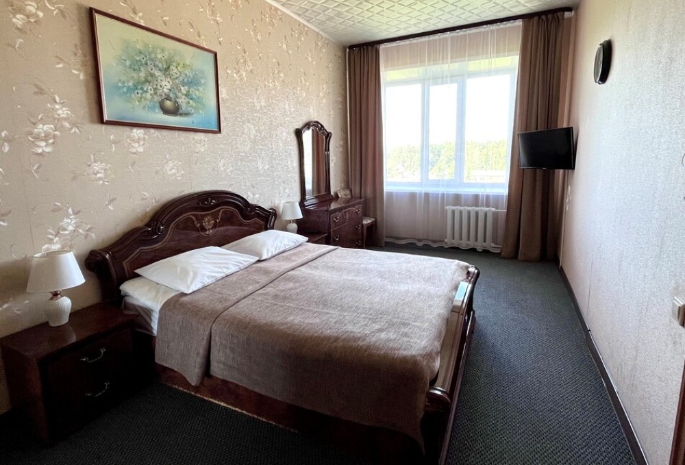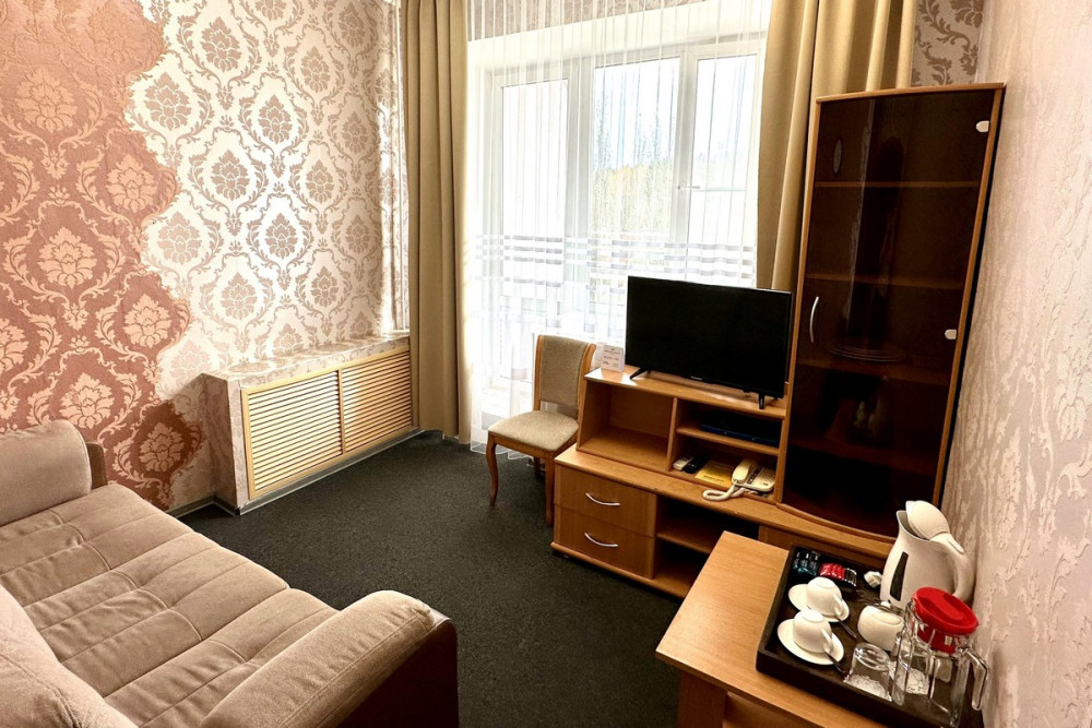Санаторный комплекс представлен единым зданием, корпуса которого (два спальных 5-этажных корпуса, лечебный блок и столовая) объединены теплым переходом. Вместительный номерной фонд представлен несколькими категориями, оформленными в разных стилевых решениях. Каждый номер обеспечен всем необходимым. Есть душ/ванна, санузел, предметы гигиены, ТВ, телефон, холодильник, фен, сейф. Комплектация номеров класса люкс и выше дополнена кондиционерами, халатами и тапочками.