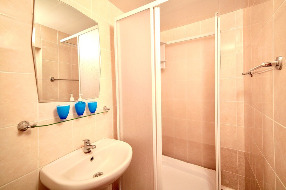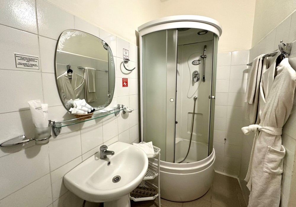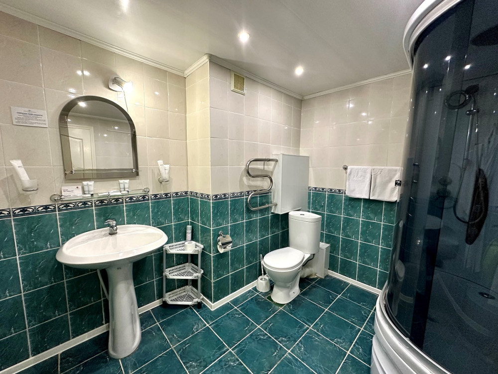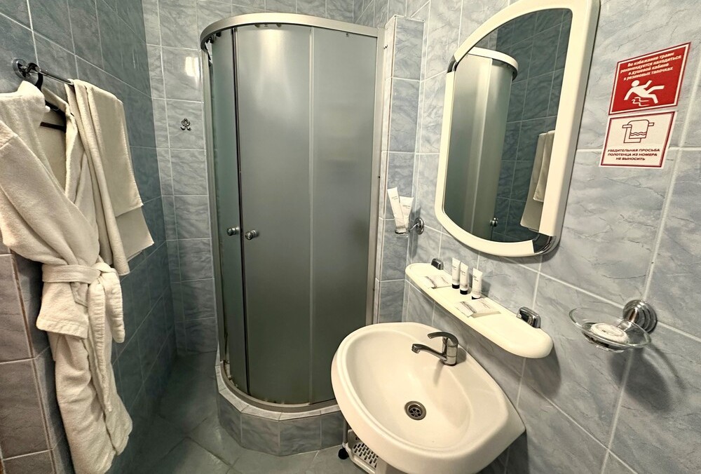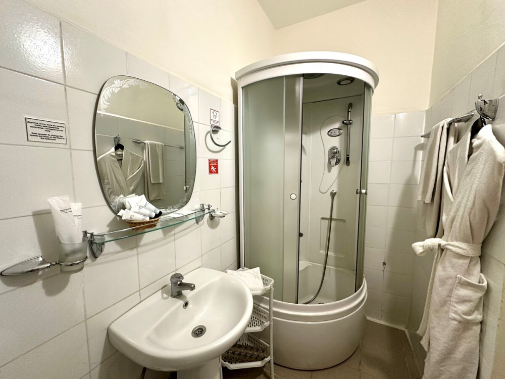 с душевой кабиной: ; тапочки: ; туалетные принадлежности: ; фен: ; халат: ;