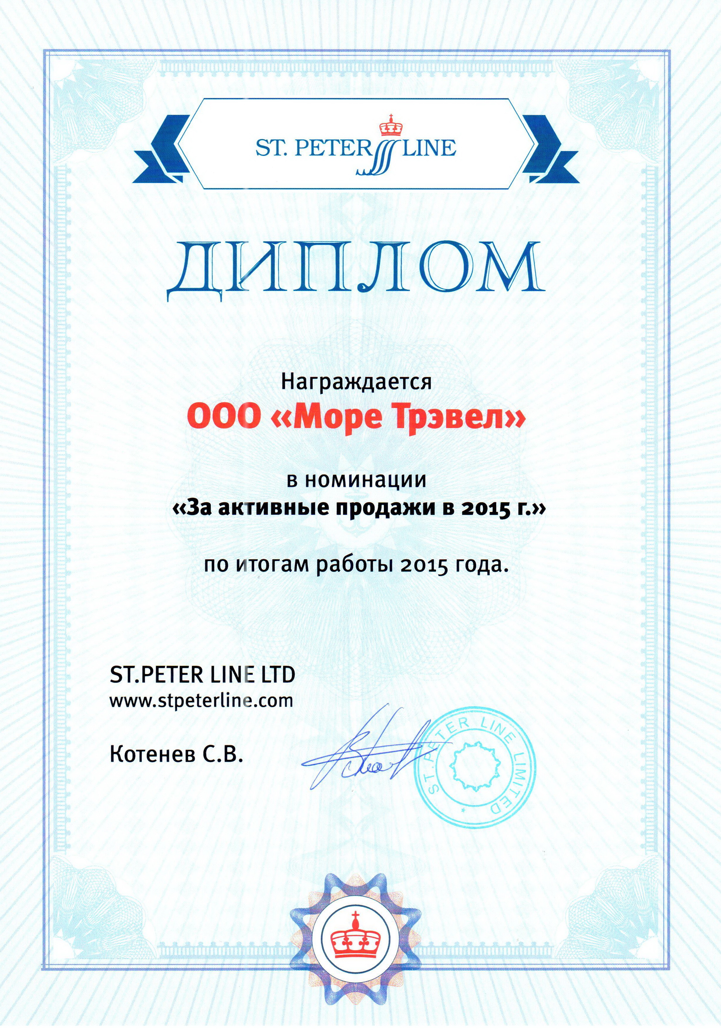 Диплом от «St.Piterline» Балтийские круизы в 2015 году были новинкой в ассортименте компании «Море Трэвел». Подробнее о Балтийских круизах и спецпредложениях можно прочитать в разделе Морские круизы.
